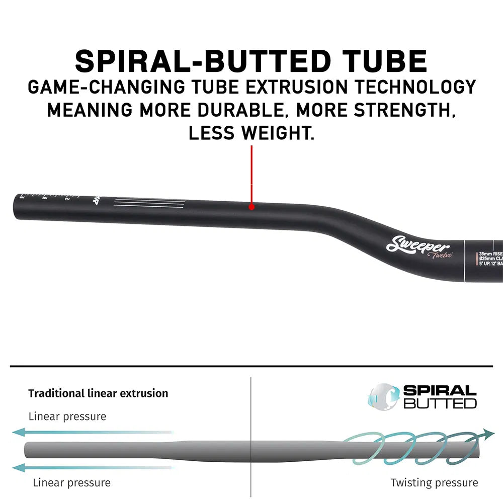 The Sweeper is available in two clamp diameters, 31.8mm and 35mm O/D, with the sweet-spot rise of 35mm. Finished in vapour-blast matt black for that ultra satin, almost-carbon-fibre look.