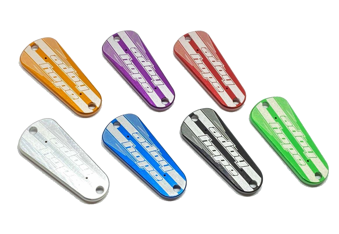 Hope Tech 3 Reservoir Lever Cap all 6 Hope colours PLUS the team Green colour option available. These lids will work on both left and right Tech 3 levers.