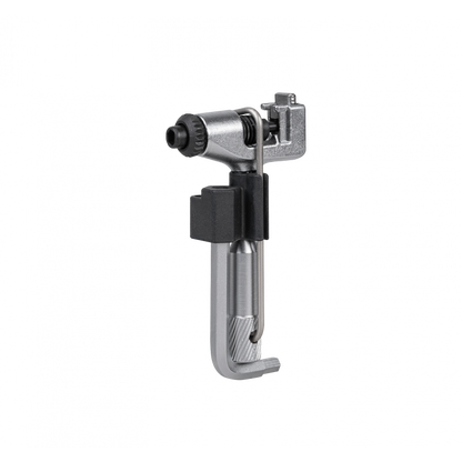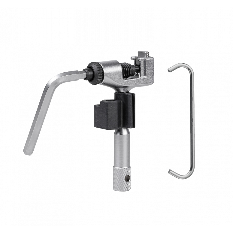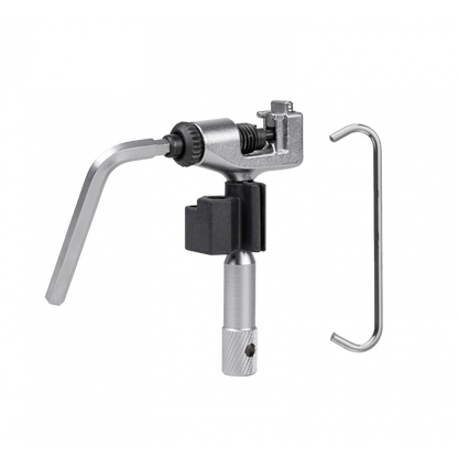 High quality, long service life, cast CrMo steel construction chain tool for single and multi-speed chains up to 13 speed, including Campagnolo® hollow pin chains. Built-in clip holds tool pieces together. Contains 4 and 5mm hex wrenches and chain hook.