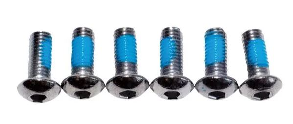Pack of 6 spare Disc Rotor Bolts by Weldtite. Each with a blue coating on the thread (threadlocker) to keep the screw in tight and avoid loosening or corrosion.